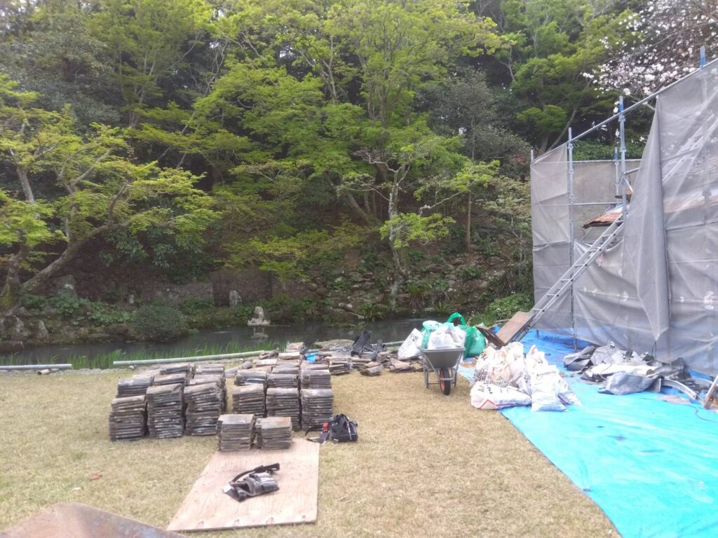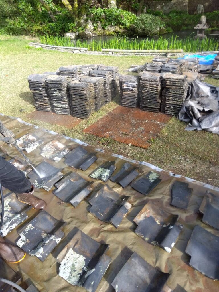 長崎県平戸市にある棲霞園(せいかえん)にて、屋根の葺きなおし工事を行いました。